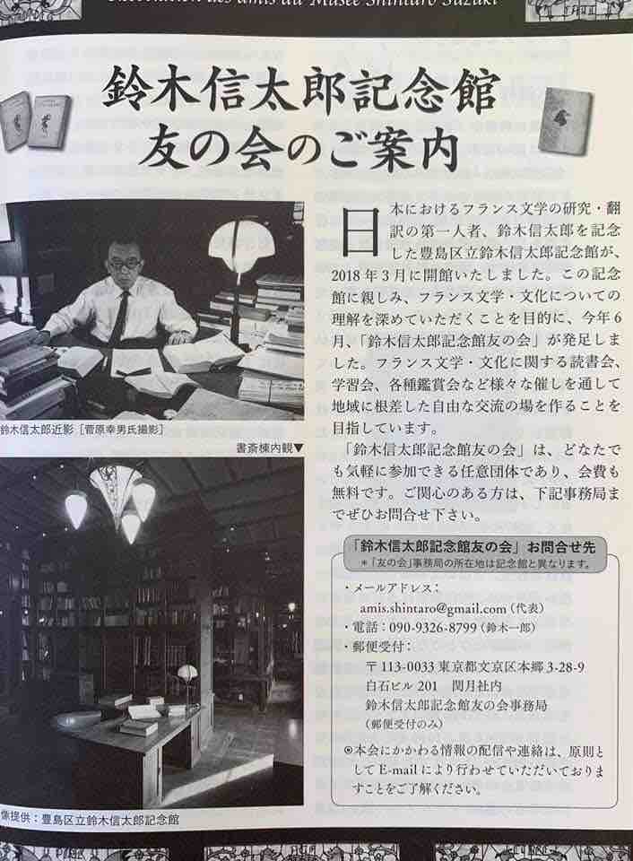 日本におけるフランス文学の研究・翻訳の第一人者、鈴木信太郎を記念した豊島区立鈴木信太郎記念館が、2018年3月に開館しました。この記念館に親しみ、フランス文学・文化についての理解を深めてもらうことを目的に今年6月に発足した「鈴木信太郎記念館友の会」についてのお知らせです。