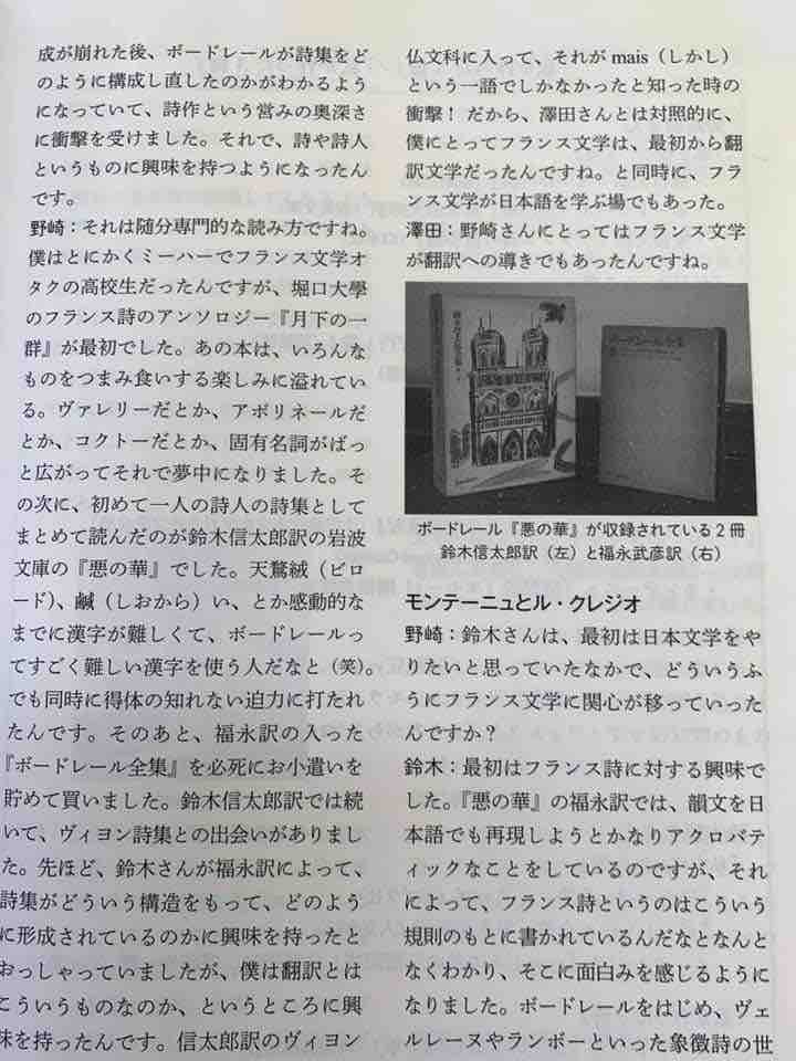 現在私のTwitterは更新を止めているが(TwitterJPのメディア公平性が特定団体との提携により失われているため、解除までは投稿をやめる予定です)この会と白水社のふらんす11月号、鈴木信太郎訳書の話題をだしたところ、洋楽リスナーほか美術関係や音楽関係のつながりの方から、ボードレールは鈴木訳が好きだった、とか高校生のころ翻訳で読んだという声が寄せられた。
