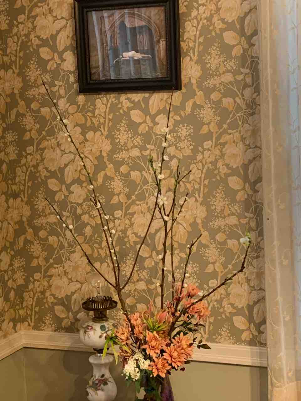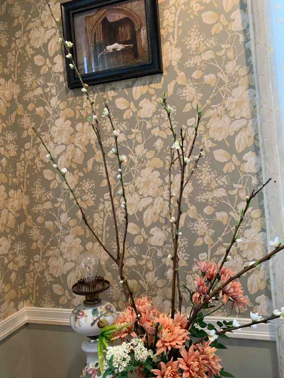 白い桃の花にベージュ色のスプレー菊、緑のグロリオーサをいけました。